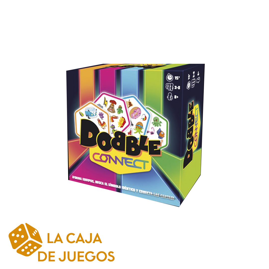 En Dobble Connect tendrás que nombrar lo más deprisa posible el símbolo que tiene en común con alguna de las cartas ya colocadas. Conecta 4 cartas de tu color para ganar la ronda y gana varias rondas para ganar la partida. Además, todos los equipos juegan a la vez, así que tendrás que darte prisa y no perder de vista a los demás equipos para bloquearlos con tus cartas antes de que ellos hagan lo mismo contigo.